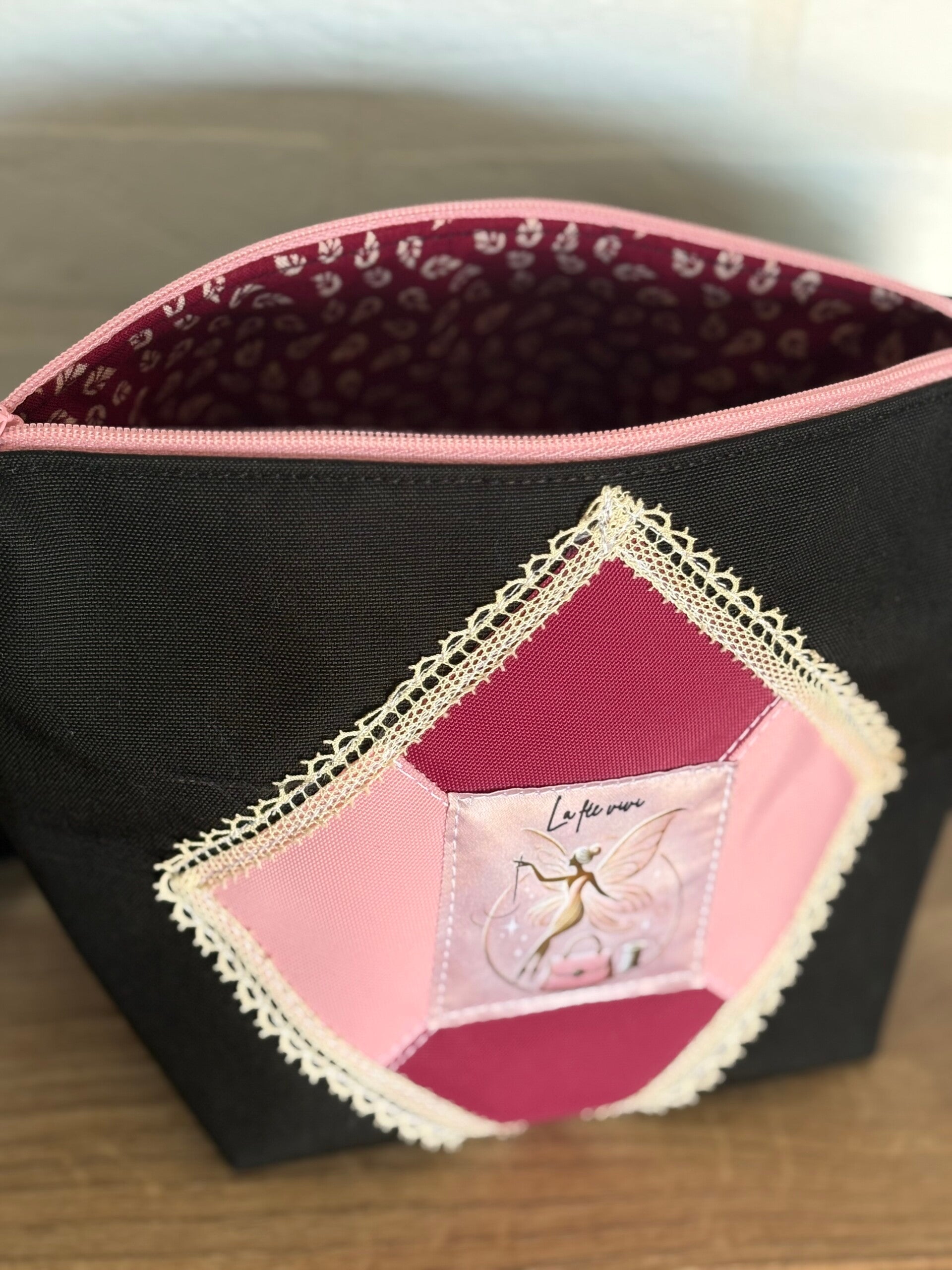 Il est petit de taille mais vraiment très pratique avec ses mesures de 24 cm de largeur , 15 cm de hauteur et 12 cm de profondeur. Il a un intérieur doublé en imprimé rouge fleuri et contient deux poches